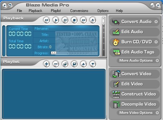 BlazeMedia Pro is a powerful, all-in-one multimedia software supporting all popular media formats, audio/video playlist, conversions, audio editing and recording, video editing and capturing, and video construction/decompiling.