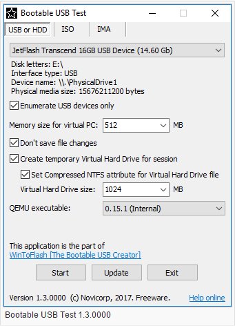Bootable USB Test is easy to use and requires no installation. It will enable you to check a target USB drive without going through two (sometimes lengthy) system restarts. It will create a virtual PC environment and boot up the USB drive for testing - simultaneously locking the drive from Windows to avoid any overwrites from outside the simulation. It then redirects all writes to the USB inside the sim to a temporary file (creates a snapshot at simulation start) and creates a temporary virtual hard drive for compatibility and better real-time PC simulation.