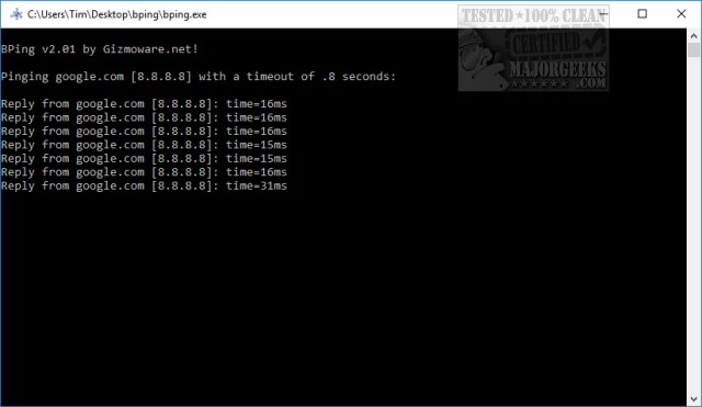 Bping can also function as an internet connection tester. Run "bping" with no command-line arguments and it'll keep testing your internet connection. We discovered that clicking the Window with your mouse works as a pause. Hitting any key will resume pinging.