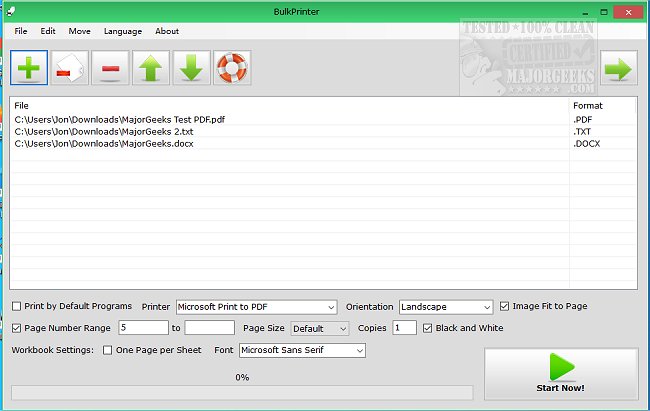 BulkPrinter is designed to be as easy-to-use as possible, permitting you to bulk print multiple documents in different formats such as PDF, WORD DOC/DOCX, Excel XLSX/XLS/CSV, PowerPoint PPT/PPTX, JPG, PNG, GIF, TIFF, and more. The operation is simple, add the files for printing and click the Start Now button. BulkPrinter then automatically sends each file to your printer until all queued jobs are complete. Having it do all jobs automatically allows you to multitask until the queue is empty.