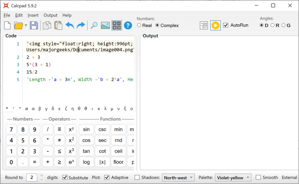 CalpPad's interface has an input window to the left and an output window to the right. Fortunately, the output windows offer a help file before calculations, which makes getting started much more straightforward.