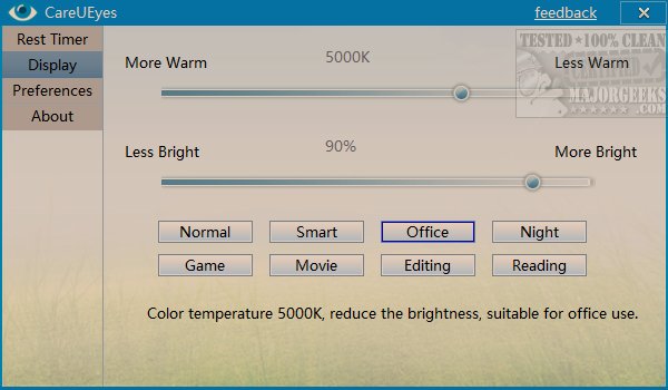 CareUEyes has a pleasant interface, and it's quite simple to use. By default, you begin with the display settings to use sliders for warmth and brightness. Presets are available for Normal, Smart, Office, Night, Game, Movie, Editing, and Reading. Each preset, when clicked, explains the goal behind that preset.
