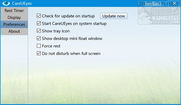 Preferences allow you to start with Windows, use the tray icon, mini float, force rest, and do not disturb when full screen.