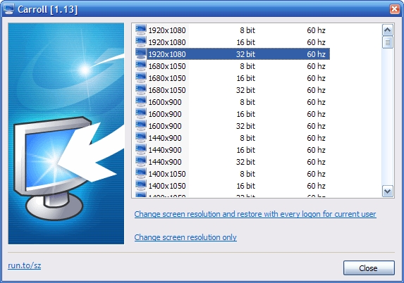 Carroll is started automatically for every user. At the first run, the application shows all available screen resolutions. Select your desired resolution, click Change screen resolution, and restore with every logon. Next time, Carroll will change the screen resolution automatically without displaying the user interface.
