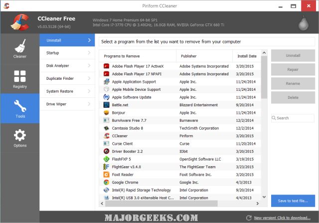 CCleaner is an easy-to-use, safe, well-known drive cleaner with other additional features, including a conservative registry cleaner, startup manager, and more. Video tutorial available. CCEnhancer can extend the cleaning capabilities of CCleaner.