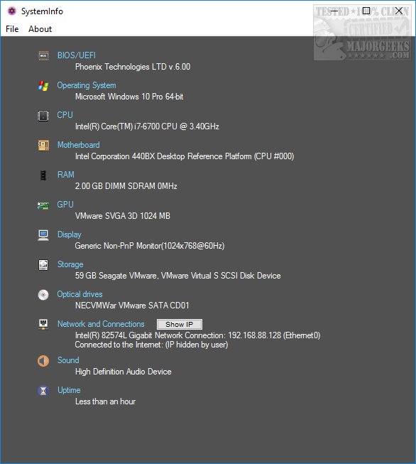 CherryPill starts up within seconds. Information provided includes the BIOS, operating system, CPU, motherboard, RAM, GPU (video card), display, storage, optical drives, network and connections, sound, and system uptime. For security, you can hide your IP address.
