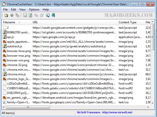 ChromeCacheView doesn't require any installation process or additional DLL files. Copy the executable file (ChromeCacheView.exe) to any folder you like, and run it. After you run it, the main window displays the list of files currently stored in the default Google Chrome user's cache.