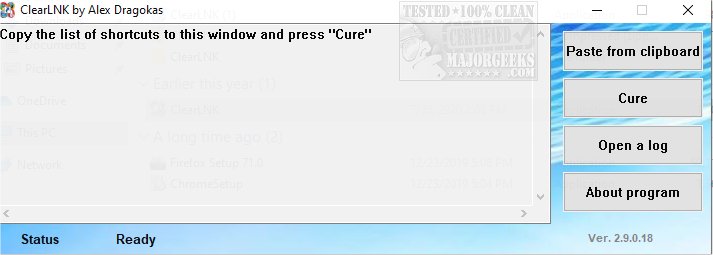 To use ClearLNK, you want to check browser shortcuts by running Check Browsers' LNK.exe. Then unpack and run ClearLNK.exe. Now drag & drop the report file you created to ClearLNK. Now, copy the list of shortcuts, start ClearLNK, paste this list to the window and click the button "Cure."