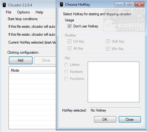 This app can be useful for gamers needing repetitive clicks to advance they can simply set up Clicador and let it perform them saving your hand from fatigue. It can simulate clicks at the current location or a predefined screen location. Once launched, Clicador is presented from a relatively simple interface. From there you have the ability to select a hotkey, start and stop conditions, etc. You can also add, clone or edit clicking configurations as well. For instance, Clicador can be set to delay the click simulation, then perform consecutive clicks for specific time intervals.