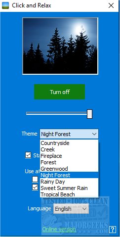 Click and Relax can be used to distract yourself from the busy city or work rhythm. It can also help improve your overall mood, relieve stress, and create a pleasant ambiance that can help you sleep. Forget about the stress of your day and enjoy the sounds of nature. It can be easily deployed from the systray and has a simple UI that allows you to change between themes quickly. If you can't physically get outside for a break, then sit back, close your eyes and let the sounds of nature engulf you.
