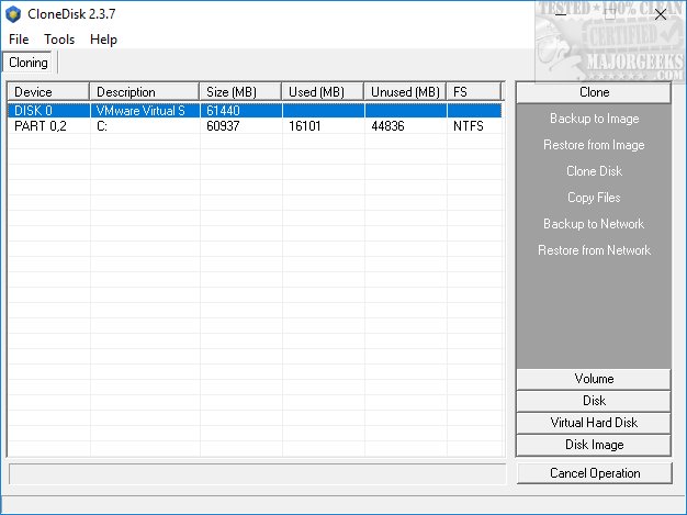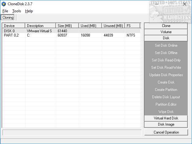 Clonedisk has a large information panel to the left and all available operations in a menu to the right. These include Clone, Volume, Disk, Virtual Hard Disk, and Disk Image.