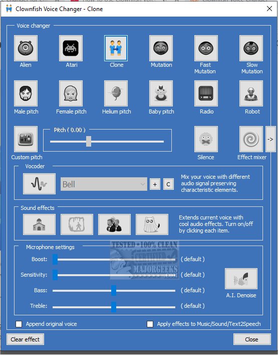 Clownfish Voice Changer includes the following voice effects: Alien, Atari, Clone, Mutation, Fast Mutation, Slow Mutation, Male Pitch, Silence, Female Pitch, Helium Pitch, Baby Pitch, Radio, Robot, and Custom Pitch.