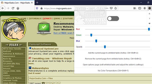Color Temperature (Change Lux) is designed to be simple to use. Open it up and slide to on - that's it. Once turned on, you can slide the color selections to make the perfect color scheme. You can also view the value and also whitelist pages, etc. By default, the colors are 255 for red, 147 for green, and 41 for blue. You can change these values, and they will be auto-saved. This add-on/extension supports most popular browsers, including Mozilla Firefox, Google Chrome, and Opera.