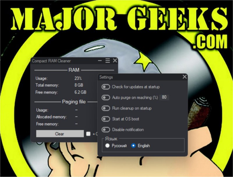 In settings, you can check for updates on startup, auto-purge at a set percentage, run on startup or OS boot, and disable notifications. Russian and English languages are available.