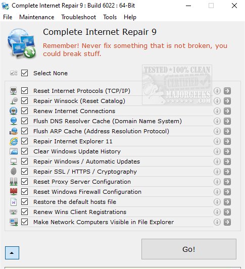 With any repair utility, you will need to remember only two golden rules. Firstly, don't try and repair something that is not broken; you might break it. Secondly, the utility can't fix it all. They are not like the all-seeing and all-knowing Oracle and cannot anticipate every situation, but this all said, this utility should help with most situations. Rizone Complete Internet Repair is basically a combination of Internet Recovery KIT and Winsock Repair.