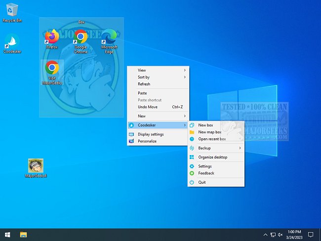 Not only can you place items inside desktop boxes, but you can also opt to select the Organize Desktop option, which sorts and places items for you. Once items are contained within their separate boxes, you can choose a large or small display, name the box, or disband it (this will place the items back in free-range desktop mode.