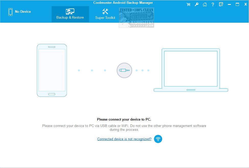 The main window of Coolmuster Android Backup Manager is designed with user-friendliness in mind. It is intuitively crafted to cater to individuals with varying levels of PC proficiency, ensuring that even those with limited technical skills can easily comprehend and utilize its functions. The interface presents users with two primary options: the ability to create a backup of their device's data and the option to restore information from a previously saved backup. This clear and straightforward approach simplifies the process, empowering users to manage their Android data with confidence and ease.