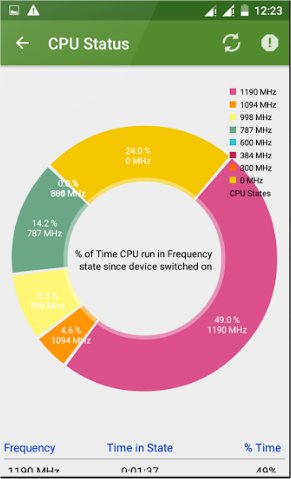 CPU X will also give you the current CPU status from powering up and provide a time percentage that the device's CPU has been run frequency state. You can also utilize the semi-transparent widget for at-a-glance device status.
