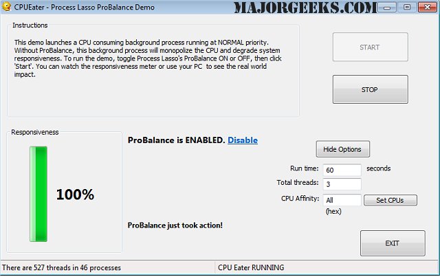 You will be able to set the runtime, the total number of threads, and target CPUs. It will display a percentage that represents how your PC is responding to a load and, as stated above, can be run in conjunction with Process Lasso, or it can be used without.