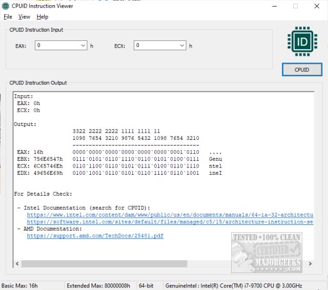 CPUID Instruction Viewer is a portable app designed to help developers view technical information returned by the CPUID instruction from the x86 and x86-64 instruction sets.