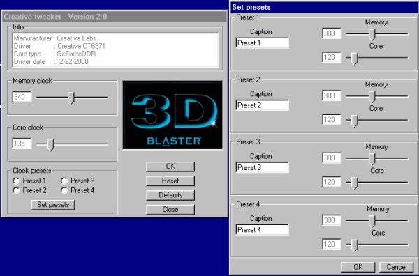 Changes memory and core clock speeds for Creative drivers on GeForce based cards (DDR & SDR) and TNT 2 Ultra (although support for TNT 2 Ultra it's still in BETA stage).. The program is very easy to use.Set the clocks to the desired speeds and press Ok.That's it!
