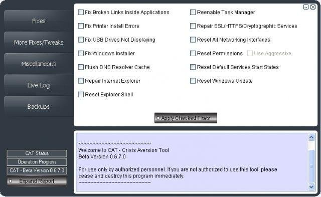 Crisis Aversion Tool aides in computer repairs with a large collection of commonly needed windows fixes, a full Restore Point Manager, research tools/links, and more.