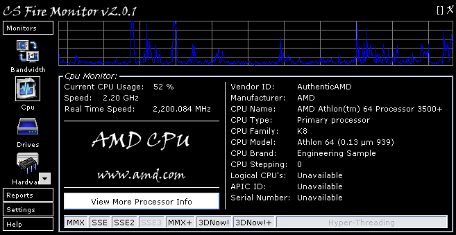 The CPU monitor detects the current CPU usage of the system. Also detects current speed of the CPU as well as many other facts on the CPU installed. A real time clock speed is part of the monitor to show real time current CPU speed.