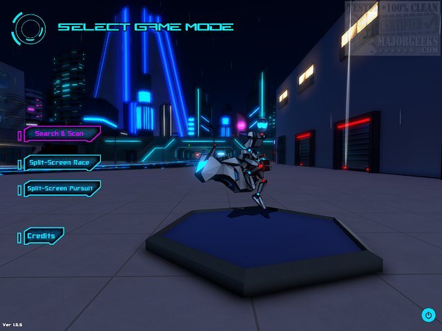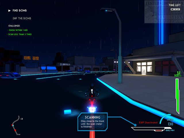 You can choose between three different action-packed game modes. The first mode is Search & Scan; this has you racing against the clock to find an armed bomb that is located inside a truck that is navigating through the city. Second up is Split-Screen Race; here you can race against another player immersed in the Cyber Cycle city. And last is Split-Screen Pursuit; this mode breaks the playing into cop versus robber. In the Split-Screen Pursuit mode player one (cop) searches for player two (robber) and attempts to take out his bike - all that player two has to do is stay on two wheels and live to tell about it.