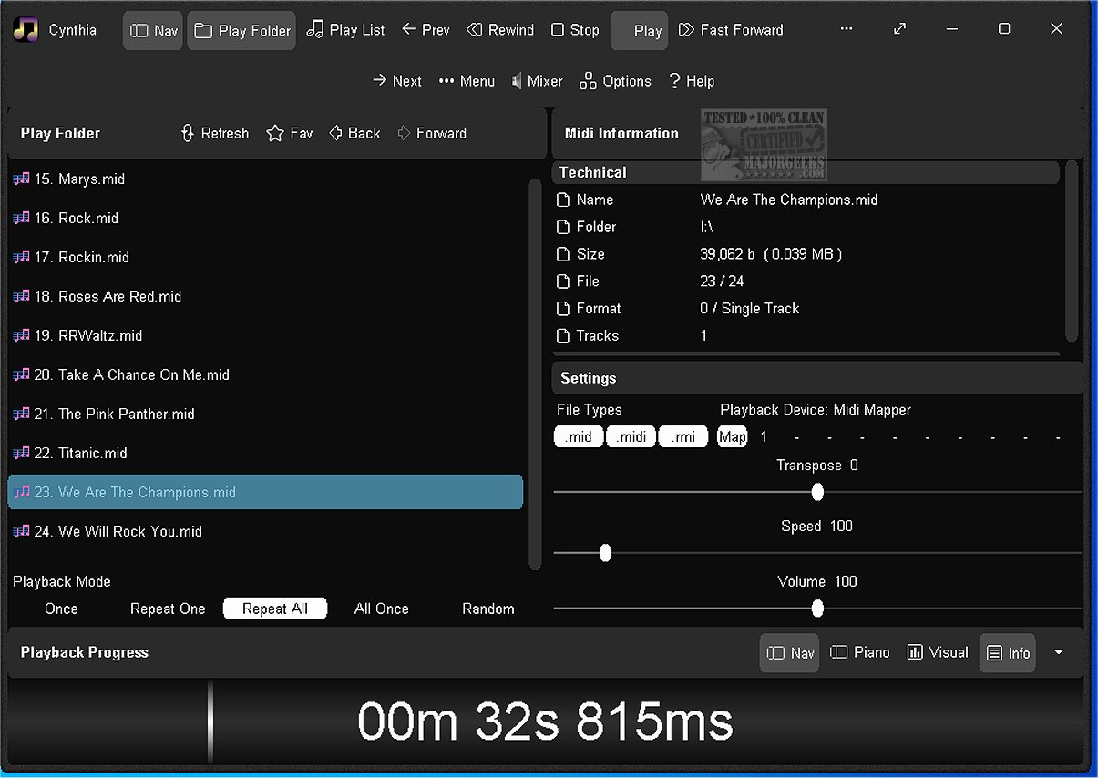 The user-friendly interface features a large playback progress bar that enables seamless navigation through your music; with a simple click or tap, you can jump forward or backward in the track, making it easy to find your favorite moments. Cynthia supports various MIDI file formats, including .mid, .midi, and .rmi files, accommodating both Format 0 (single-track) and Format 1 (multi-track) files.