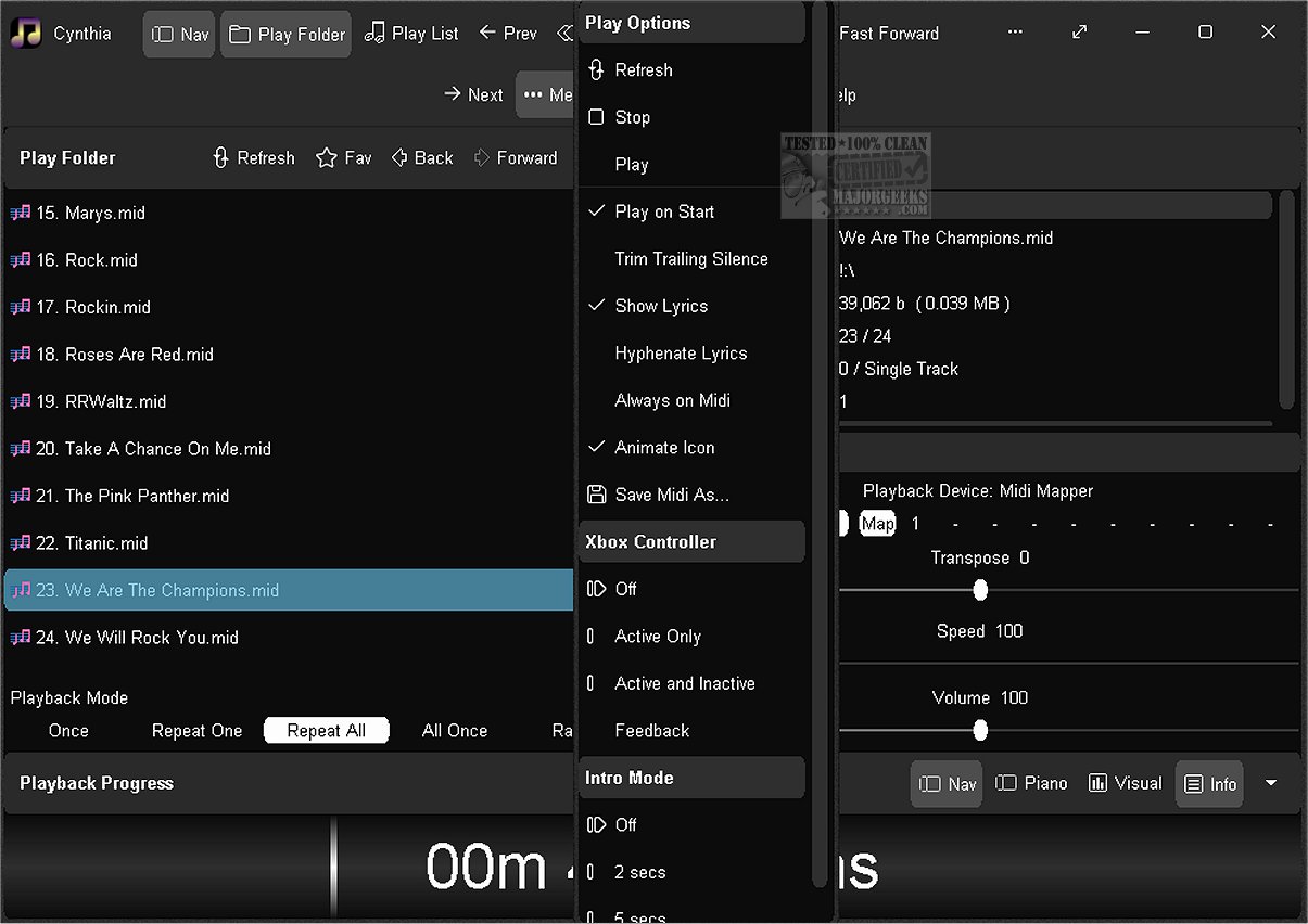 ● Use an Xbox Controller to control Cynthia's main functions - playback speed and volume, song position, display panels, song file navigation, jump to start of song, toggle full screen mode, etc