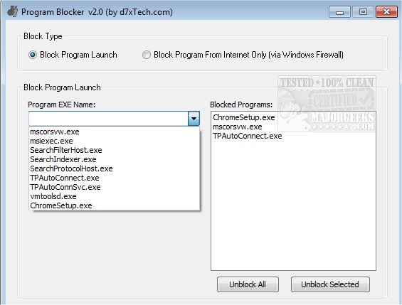 d7xTech Program Blocker comes preloaded with several potential programs to be blocked, and they can be selected and added to your list. You do have the choice to unblock one or all of the programs if the need arises. Additionally, you can also select between blocking the program launch and blocking the program from the internet via the Windows Firewall.