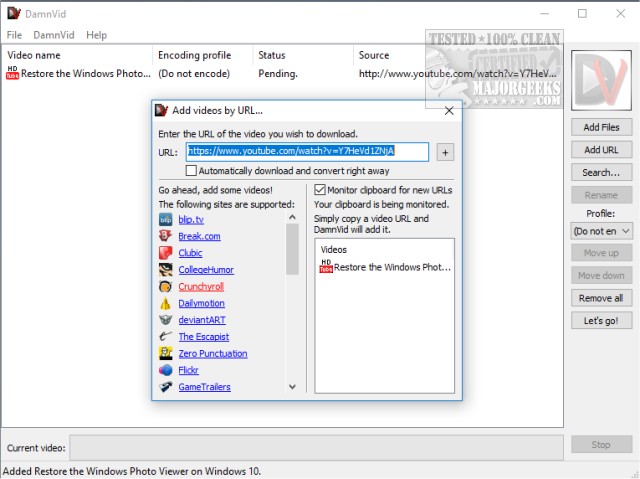 The interface is relatively simple. Add files, or enter a URL. If you have a URL in your clipboard (memory), it will auto-load that for you. Other options also become available including monitoring the clipboard, automatic download and convert and adding more videos from other popular websites. Otherwise, you can close the windows and return to the main windows where you can select encoding options. By default, all encoding options are off.