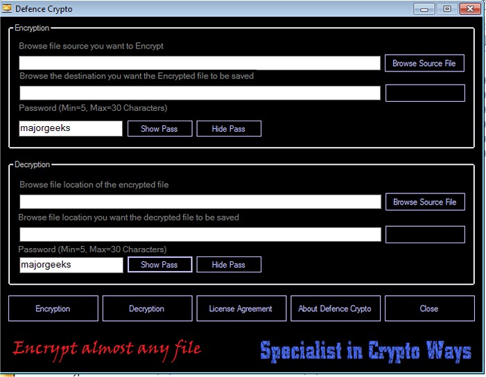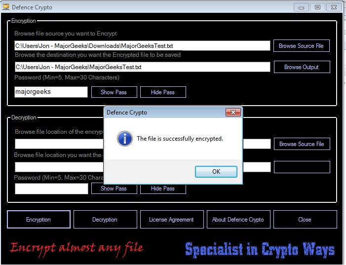 Defence Crypto allows you to select a personal password of 5-30 characters ensuring that the data you have encrypted stays private, but make sure to keep track of the password key you select or you'll be out of luck.