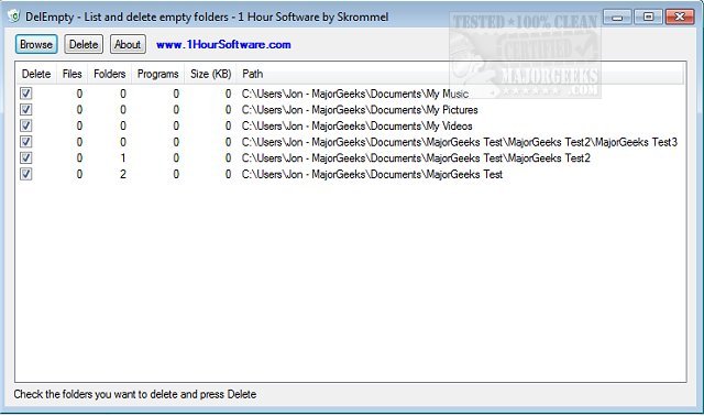 After DelEmpty has finished scanning it displays the results and allows you to delete any empty folders that it is has located. It is portable, so you can take it with you for folder cleaning on the go.