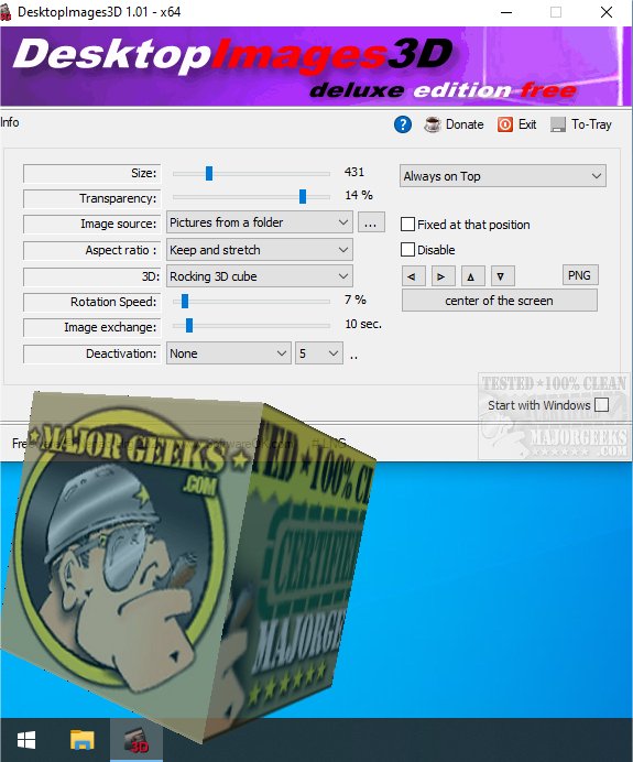 DesktopImages3D is a fun option to display your favorite images in a floating or fixed 3D cube. You can have your desktop background and focus on highlighting images in the floating 3D cube. The cube can be set to rotate and exchange images at user-defined intervals. There are also presets for the cube type, like rocking cube or rotating square. You do have the choice to have the image always on top, among several other options. Additionally, you can set deactivation triggers for mouse events, key presses, or both.