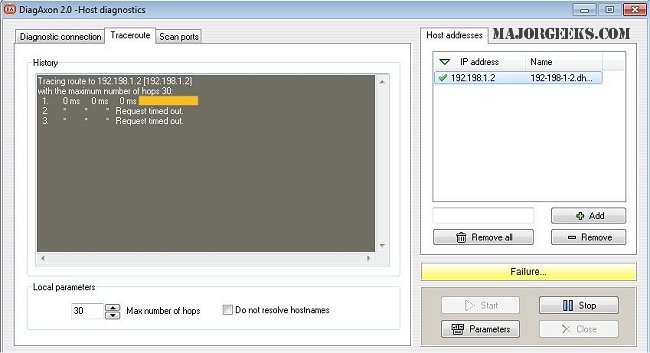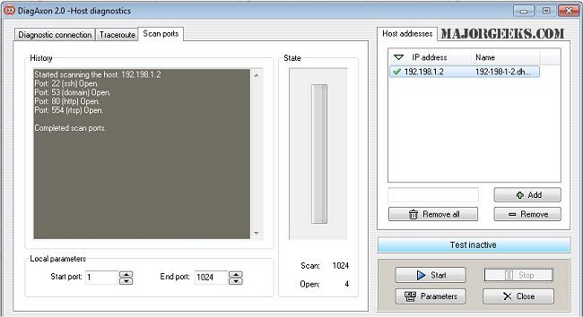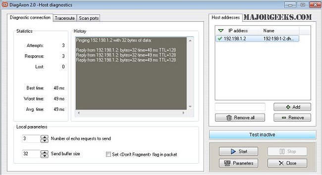 DiagAxon is a free program that allows you to check the current availability of a host on the network by performing a ping operation. Additionally, the application enables you to analyze the way in the global network packets (traceroute) as well as scan ports. The results can be copied to clipboard from the 'History' window and pasted in a document, for further processing.