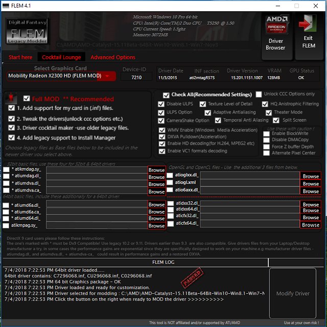 Digital Fantasy Legacy Modder gives you a simple way to make modded drivers for your legacy GPU. This is accomplished by adding your personalized card-specific support to new AMD drivers. It will detect your card and then add the relevant modifications required for you during modification. Unlike other modding tools, this is not a mass modder. It modifies drivers according to the GPU specification of the system that it is running on. Automatically detects your GPU and mods the driver according to your GPU specifications. Since the info is read directly from your card, the accuracy rate is high when configuring the driver specifically for that card; support is always available for your card.