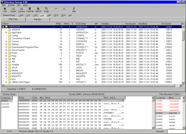 Directory Snoop is a cluster-level search tool that allows Windows users to snoop through their FAT and NTFS formatted disk drives to see what data may be hiding in the cracks. Use Directory Snoop to recover deleted files you thought you would never see again or permanently erase sensitive files so that no one will know they ever existed. Supported media include local hard drives, floppy disks, Zip disks, MO disks, and flashcard devices.