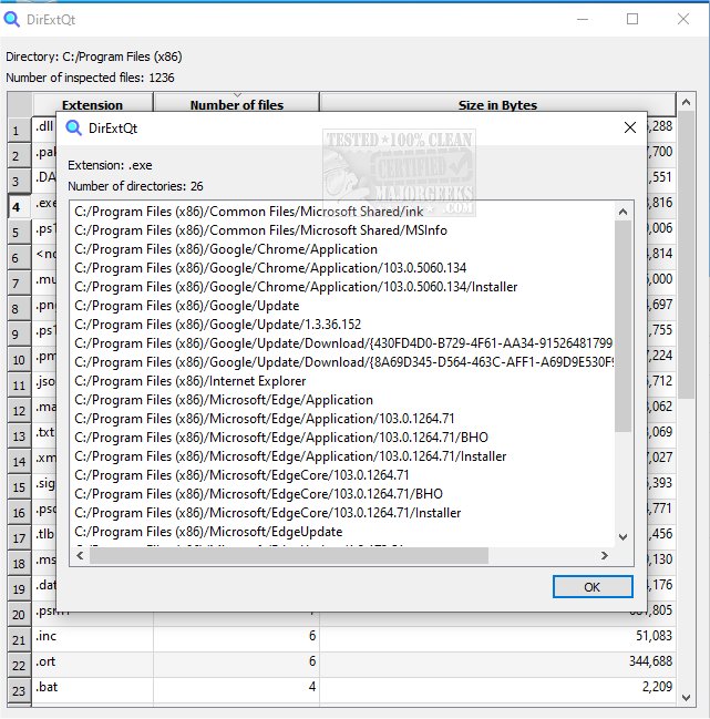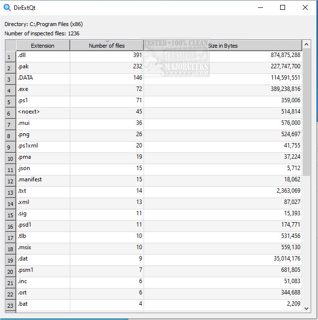 If you need to collect and display Windows file extensions in a subtree of a directory. In that case, DirExtQt works quickly and provides an organized table clearly showing extension type, number of files, and their size in bites. You can sort ascending and descending by each as well.