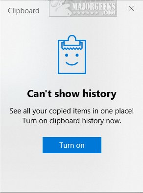 Finally, you should always be able to turn your clipboard history back on by pressing the Windows Key + V and click on Turn on.
