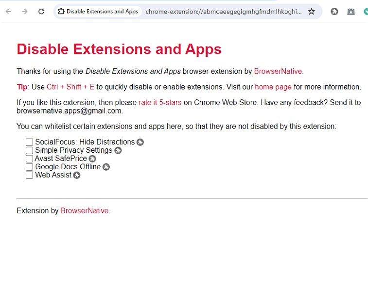 Disable Extensions and Apps Chrome extension provides a convenient way to disable and re-enable any installed extensions and Chrome apps with just a few clicks. This can be particularly useful for troubleshooting issues related to specific extensions/apps or for disabling them for performance reasons, etc., without having to uninstall them completely or manually disable each one.