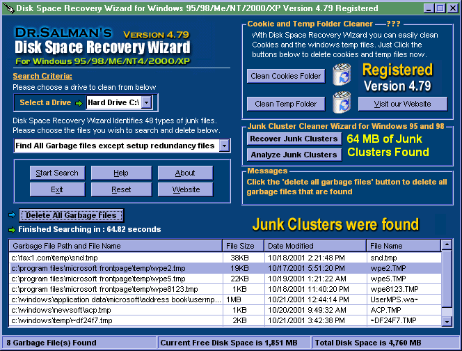 Disk Space Recovery Wizard is a system optimization and Disk cleaning tool which removes hundreds to thousands of junk files from your system allowing Windows to run faster and freeing up valuable hard disk space.