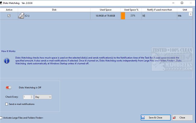 Disks Watchdog is part of Large Files and Folders Finder+, but its overall usefulness directed the author to break it off into its own independent app. It does allow you to activate Large Files and Folders Finder+ from the UI if desired. Disks Watchdog is simple to use; select the desired notification size/unit and hit save & close. The interface will show you the disk(s) and their used space in units and percentages.