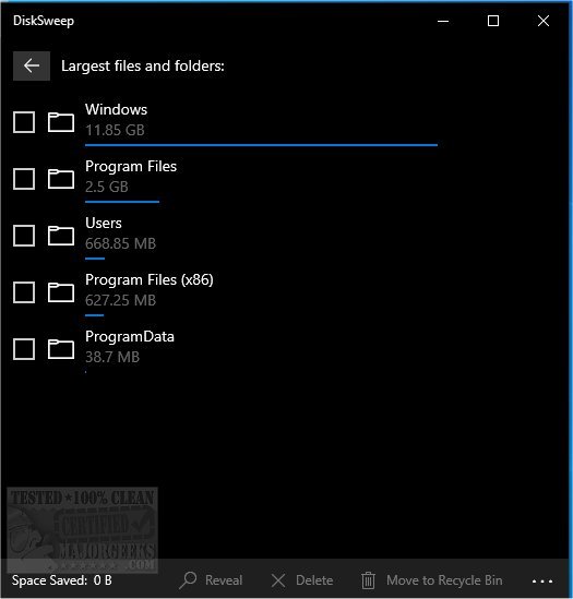 Over time we accumulate files and folders of varying sizes and importance, which take up a large amount of space. DiskSweep quickly displays the largest folders and files for a user-selected drive. And then gives you access to move those space eaters to the recycle bin freeing up space.