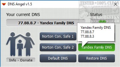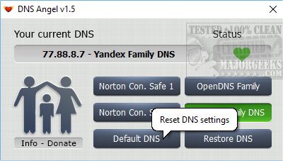 DNS Angel is portable allowing you to hide it anywhere you like on your computer. Once started you can choose to block Norton ConnectSafe 1, Norton ConnectSafe 2, Yandex Family, or Open DNS Parental Control. You can only choose one, and there's no real explanation about any of them so a little trial and error might be needed here if you're not familiar with the three family safe DNS providers. Even the Norton ConnectSafe 1 and Norton ConnectSafe 2 aren't clear exactly what's different.