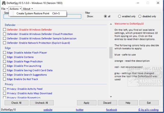 With the initial release of Windows 10 came concerns about privacy and tracking. While we think that privacy, as we know it, is virtually dead, that does not mean we should be relaxed about it. Not at all. In response, pXc-Coding created DoNotSpy10, which was one of the first-ever anti-spy tools for Windows 10. It allows you to set a restore point just in case you can easily revert if you do not like the changes. The interface gives you a list of areas where tracking or privacy is a concern. App access is always a big one, as is Password Reveal, but there are a couple you might want to leave alone, including Windows Defender and Windows Updates.