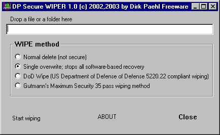 DPWipe supports normal delete (not secure), single overwrite, DoD wipe and Gutmann's Maximum Security 35 pass wiping method.