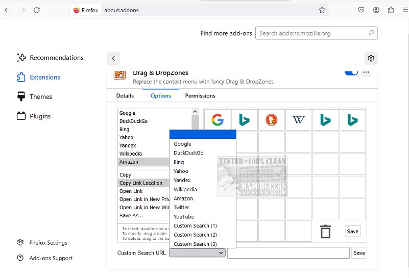 Drag & DropZones Firefox and Opera add-on extends the Firefox Search Engine manager window; you drag a Search Engine onto 1 (or more) DropZones to link them. Drag & DropZones is an innovative way to search the Internet. Once you set it up, you can activate the feature by dragging any text or link from a website.