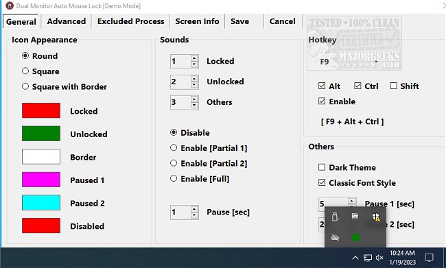 This portable app resides in the systray. Settings, etc., can be accessed from the app icon, allowing you to change various color and appearance options. For example, the default systray icon status display: Green - Unlocked, Red - Locked, Blue X - Paused, Red X - Disabled. The colors can be modified along with the icon shape within general settings. You can additionally opt to have sound notifications for an app status change. A dark theme is also available.