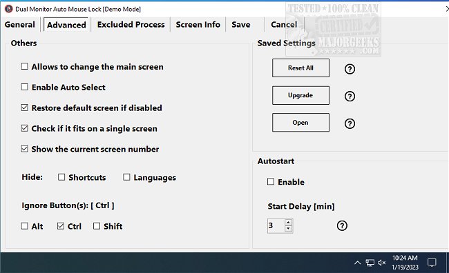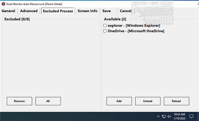 On the first start, the main screen is defined by Windows, and Dual Monitor Auto Mouse Lock will actively monitor any changes to that screen and then lock the cursor when needed. Dual Monitor Auto Mouse Lock gives you the option to modify which screen is main. You can also exclude software from Dual Monitor Auto Mouse Lock if desired.